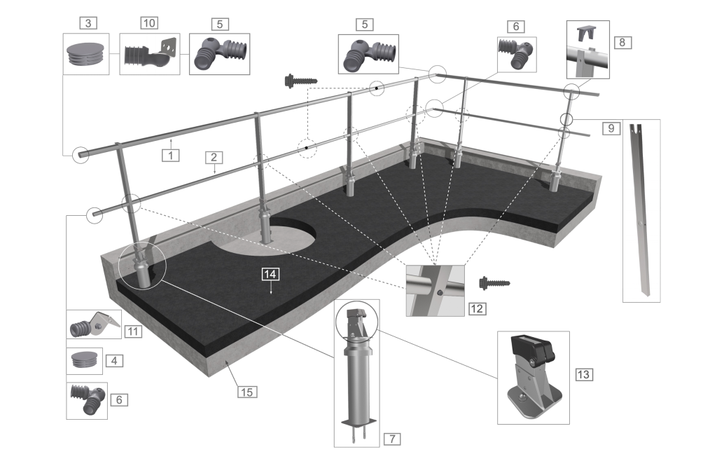 - Accesorios de fijación (ángulo, terminación)para pasamanos y tubo intermedio